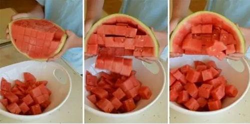 2. 切块:将去皮的西瓜切成两半,然后用刀沿着西瓜的纹理切成小块。注意,切的时候要沿着西瓜的纹理,这样切出来的西瓜块才会又甜又多汁。